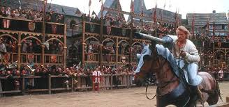 However, while there were several details in the film that were not historically accurate, the tone of the movie and the major themes all portrayed the past well. One of the most important points was William’s need to maintain his honor as a knight. He was brave to the point of foolishness, and was prepared to die in order to maintain his honor. The first glimpse of this occurred in his first jousting tournament as Sir Ulrich. A man remarks that Ulrich is fearless, and when Jocelyn asks why, Count Adhemer replies that “The slit in the visor is narrow, but splinters can penetrate it. Most knights raise their chins at the last instant. You lose sight of your opponent, but protect your eyes. Ulrich doesn’t” (Knight’s Tale). William was single-minded in his purpose of winning the joust to the point where he would risk an injury to his eyes in order to succeed. He continues to behave this way throughout the film, with the most intense example occurring at the end of the movie. He is jousting Count Adhemer and losing badly. He cannot breathe in his armor or support the lance with his already injured arm, so he takes off his armor and has Wat tie the lance to his arm. Jousting without armor could have killed William, but he insisted that he had to finish the joust in order to maintain his honor.